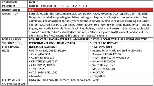 Formulated with the latest organic acid technology. Ready to use no SCA required upon initial fill. Its special blend of long-lasting inhibitors is designed to protect all engine components, including aluminum. Recommended for use where extended service interval is required including but is not limited to, Caterpillar EC-1, Cummins, Detroit Diesel, Ford, GM, Freightliner, International Truck and Engine, Kenworth, Peterbilt, Volvo Mack, Freightliner, Navistar and Western Star. Compatible with Texaco® and Caterpillar® extended life and other “strawberry-red” NAOT coolants and as well Dex-cool®, Havoline ® XLC extended life and other “orange” coolants.